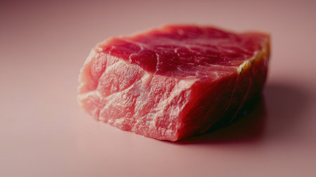 A fresh cut of beef rests on a soft pink surface, highlighting the rich marbling and vibrant color. The lighting enhances the texture, making it visually appealing for culinary use.