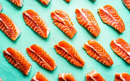This image showcases vibrant raw salmon fillets, perfectly arranged to highlight their stunning marbling and rich color, ideal for culinary use.