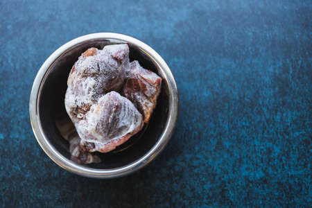 Raw frozen meat in a metallic bowl, over a blue background. Food and drink concept