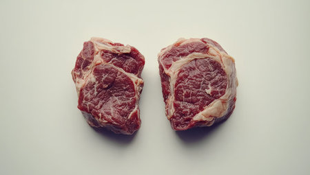 Two pieces of raw beef steak are laid flat on a plain white surface. The steaks are a deep red color and have visible marbling.
