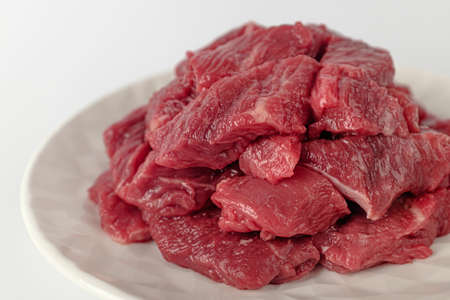Discover vibrant, fresh slices of lean raw beef on a clean white background. Perfect for culinary ingredients, meal prep, and gourmet presentations.