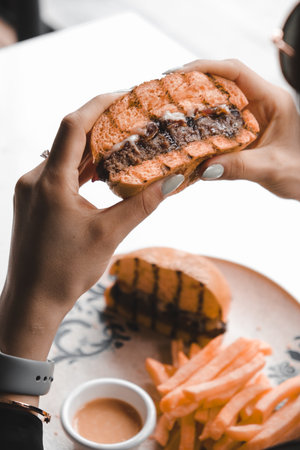 Unrecognizable young woman holding fast food fresh burger sandwich while resting on nature, point of view.