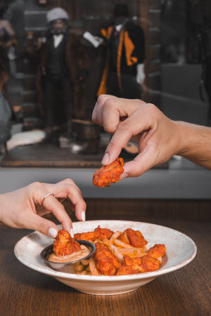 American fast food. A couple of beef and chicken skewers with a delicious peanuts sauce with some fresh salad with tomatoes and crunchy french fries. Delicious meat steaks on a wooden background.