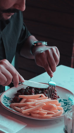 Young man with knife and fork sitting in a dark room. Maggots and cockroaches in the plate.