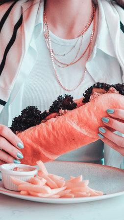 Attractive hipster dressed in leather jacket eating a vegan burger.