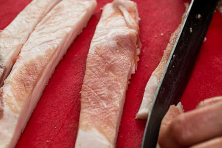 Hands of a professional butcher cutting a piece of raw pork meat with a long knife, on a white plank, at a rural butchery of Serbia. Pork meat is one of the biggest productions in Serbia.