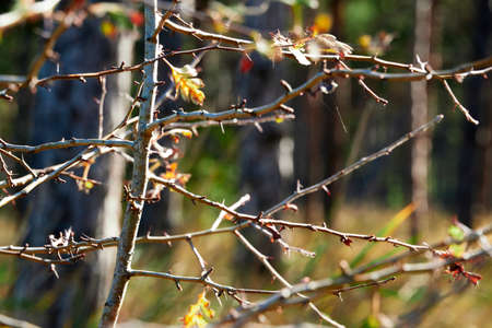 Thorns on bare twigs of tree in spring sunny day on blurred background