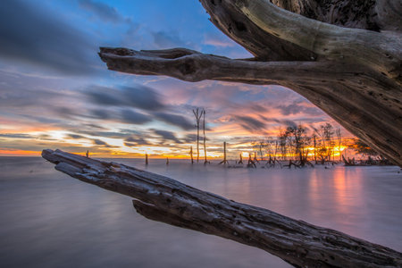 Sunset at the beach with dead tree trunks in the foreground