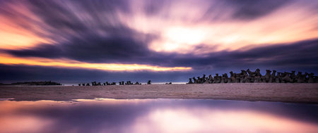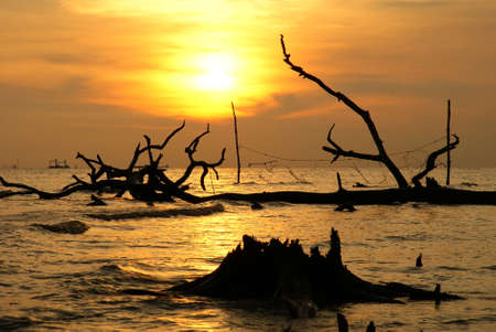 Dead trees in the sea at an eroded coastal line at Kelanang beach, Malaysia at sunset