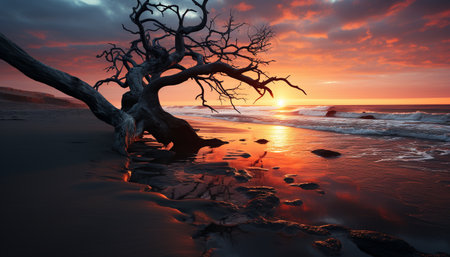 Sunset over the tranquil coastline, nature beauty reflected in water generated by artificial intelligence