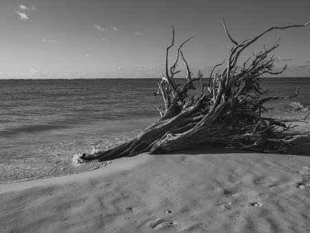 Bare roots of a tree exposed by significant beach erosion, horizontal aspect