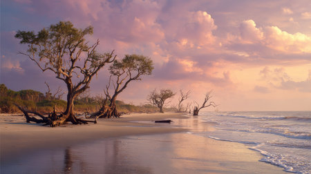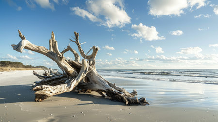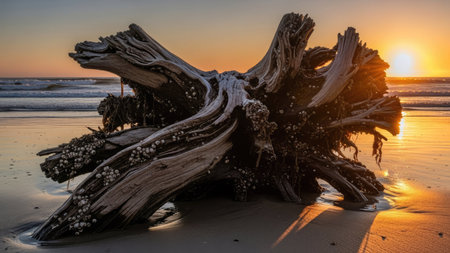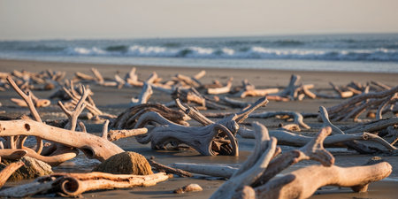 AI Generated. Driftwood formations on a serene beach at sunrise