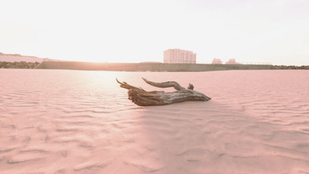 Golden sunlight bathes a deserted beach as a piece of driftwood lies gracefully on the soft sand. The tranquil scene invites calm and reflection during twilight hours.