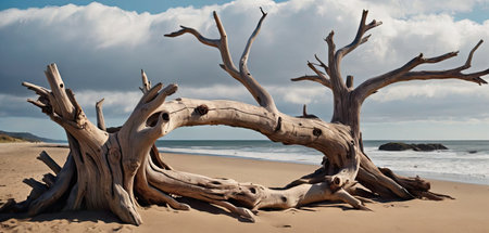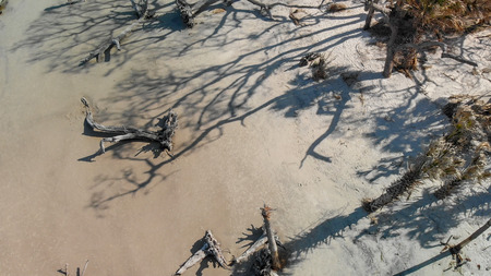 Dead trees and fallen trees on a sandy beach