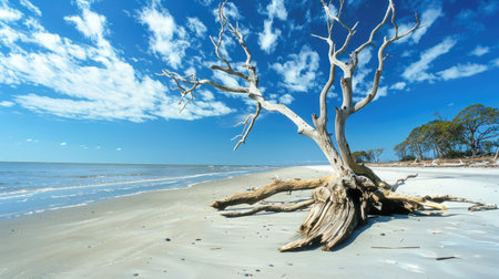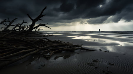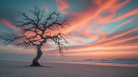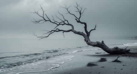 a deserted tree stands alone on the sandy beach, creating a captivating scene reminiscent of layered and atmospheric landscapes. this stunning image, captured in 8k resolution, showcases the dutch marine scene with its dark gray tones and hints of light aquamarine. the romantic riverscapes and eerie landscapes add an intriguing touch to this mesmerizing photo. ai generated