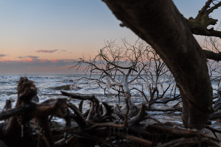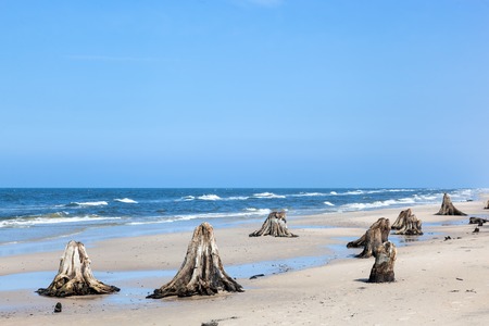 3000 years old tree trunks on the beach after storm. Slowinski National Park, Baltic sea, Poland. Unique, nature phenomenon