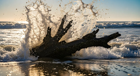 A powerful ocean wave crashes over a piece of weathered driftwood on a sandy beach, creating a dramatic splash of water droplets. The scene is backlit by the sun, capturing the dynamic energy of the sea.