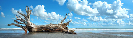 Panorama of driftwood on the beach with blue sky and clouds