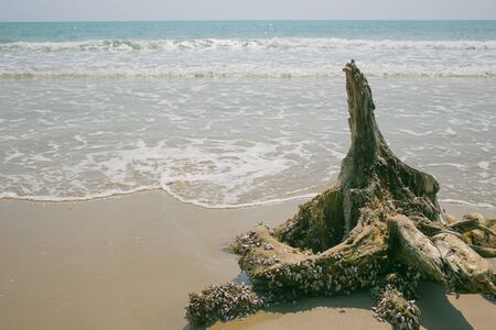 beach with old wood, silence lonely sea beach, seaside, alone seashore or seacoast concept vintage color tone for background or postcard.