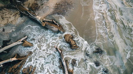 A breathtaking aerial view of waves crashing on a sandy beach, creating a beautiful water and rock landscape art in the world AIG50