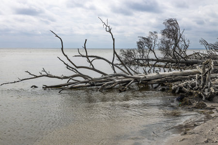 Storm battered Baltic Sea coastline with fallen trees illustrating dramatic coastal erosion