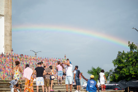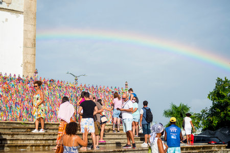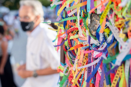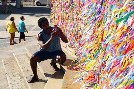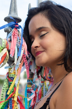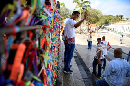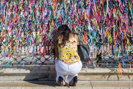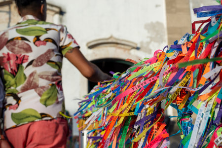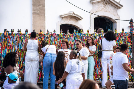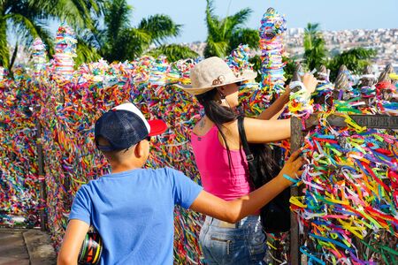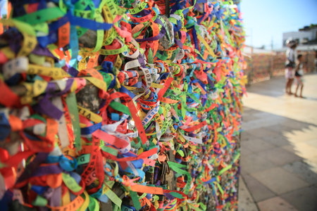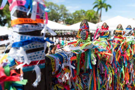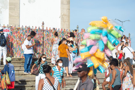 Salvador, Bahia, Brazil - January 06, 2023: Worshipers are tying colored ribbons to the railing of the Senhor do Bonfim church on the first Friday of 2023, in Salvador, Bahia.