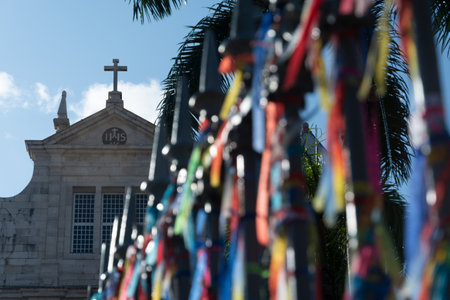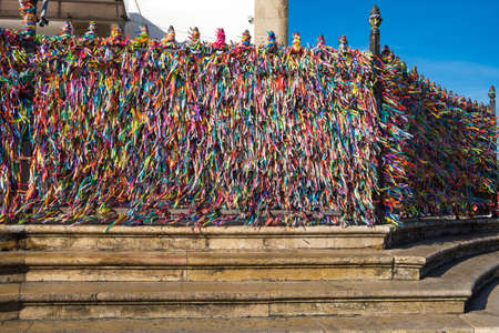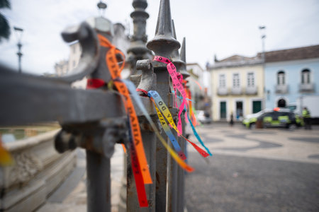 Salvador, Bahia, Brazil - December 29, 2023: Remembrance ribbons tied to the iron railing of the Senhor do Bonfim church in the city of Salvador, Bahia.