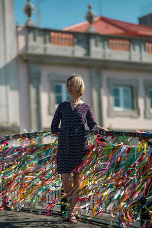 Beautiful, black-haired woman outdoors, leaning against an old iron railing full of colorful souvenir ribbons looking at the camera. Happy person traveling.