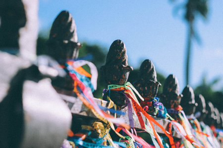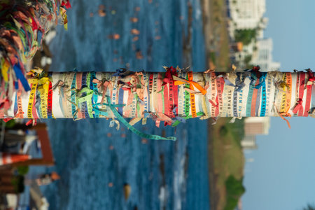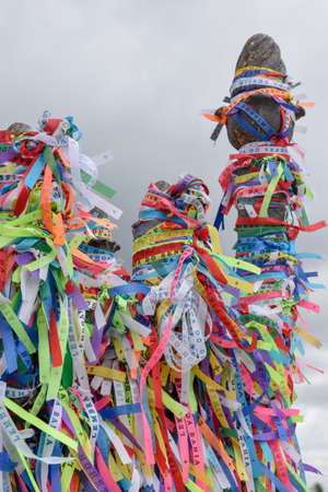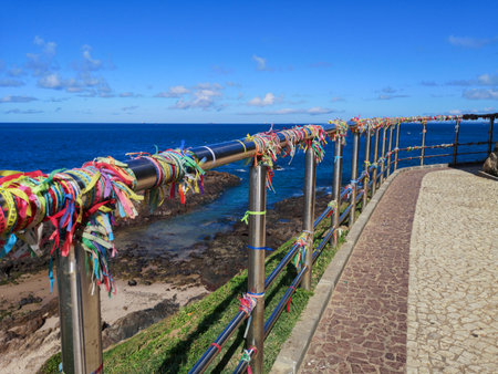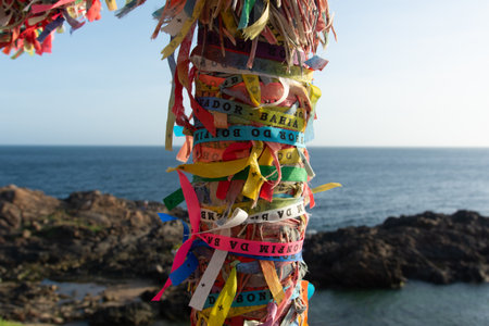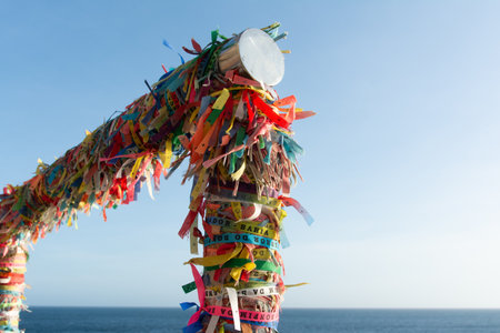 Salvador, Bahia, Brazil - December 12, 2025: Detail of hundreds of colorful Senhor do Bonfim ribbons tied to the railing of the Barra lighthouse. Salvador, Bahia.