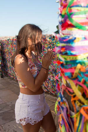 Girl making requests and tying colored ribbons on the grid in front of Bonfim church in Salvador Bahia Brazil.