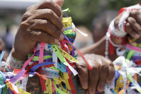 salvador, bahia / brazil - january 15, 2015: hand holds Senhor do Bonfim ribbon during traditional washing of Bonfim church stairs in the city of Salvador. *** Local Caption ***.