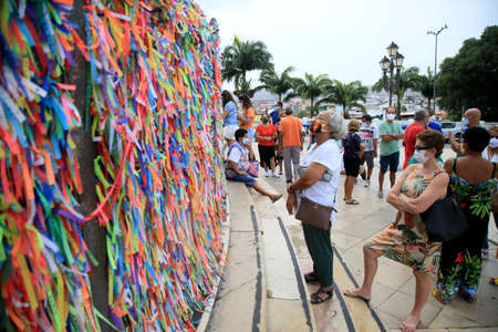 Salvador, Bahia, Brazil - January 07, 2022: Catholics are seen tying ribbons on the railing of the Senhor do Bonfim church during an open mass in the city of Salvador, Bahia.
