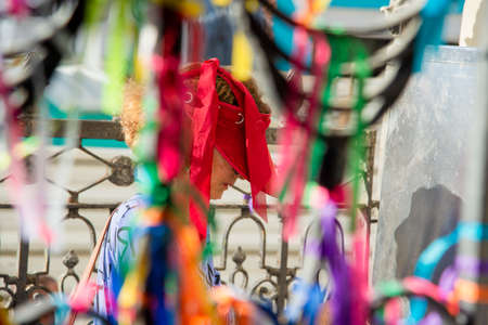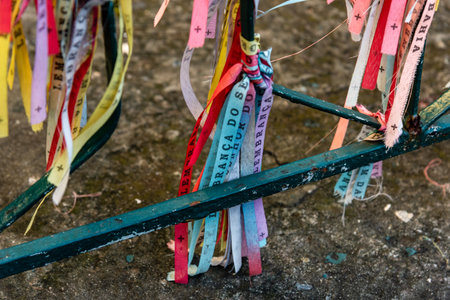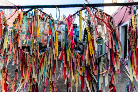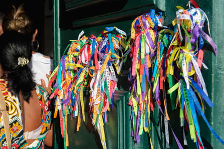 Salvador, Bahia, Brazil - July 18, 2021: Colored ribbons of Senhor do Bonfim tied to an iron gate in Pelourinho.