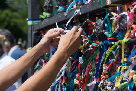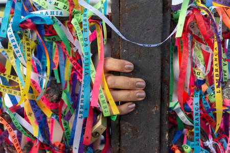 Hands tying the ribbons of Senhor do Bonfim on the iron railing. On the last Friday of the year, masses are held at Igreja do Senhor do Bonfim in Salvador, Bahia, Brazil.