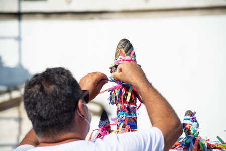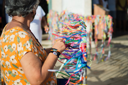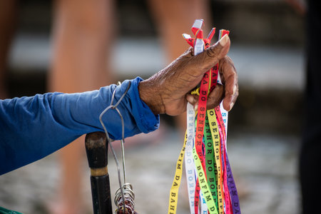 Salvador, Bahia, Brazil - January 07, 2022: Hands of a street vendor holding souvenir ribbons during open mass at the Senhor do Bondim church in the city of Salvaldor, Bahia.