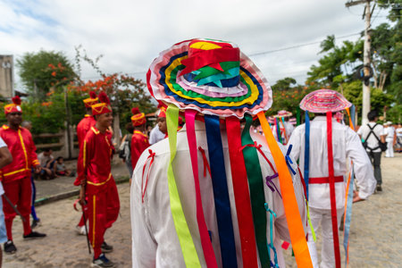 Saubara, Bahia, Brazil - August 06, 2022: Cultural demonstration called Encontro de Chegancas in Saubara, Bahia. Members of a Marujada wear white clothes with colors and play percussion musical instruments.