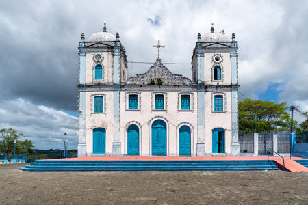 Valenca, Bahia, Brazil - September 10, 2022: Front view of the facade of the church of Nossa Senhora do Amparo in the city of Valenca, Bahia.