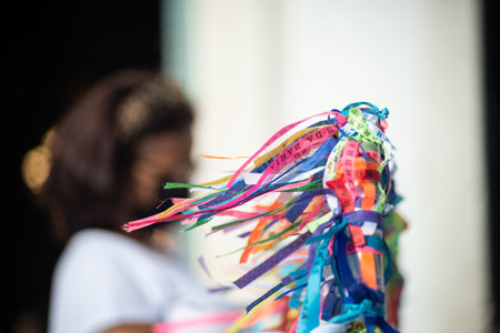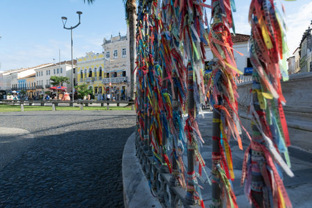 Salvador, Bahia, Brazil - January 15, 2025: View of souvenir ribbons tied to a railing in Pelourinho, the historic center of the city of Salvador, Brazil.