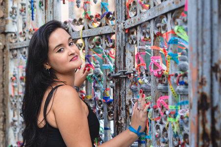 Girl in front of the grid with colored ribbons of Bonfim church in Salvador Bahia Brazil