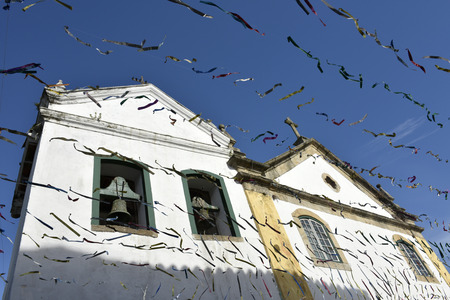 Paraty, Brazil - February 24, 2017: Typical street with colonial buildings in historic town Paraty on the time of Carnival, Brazil