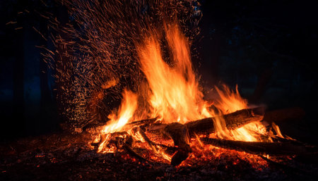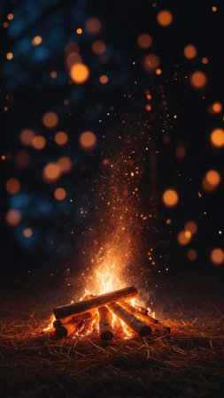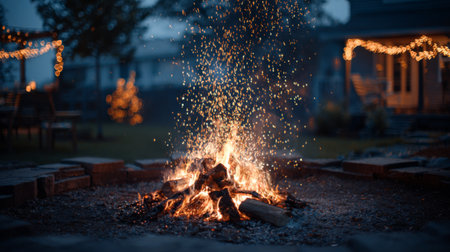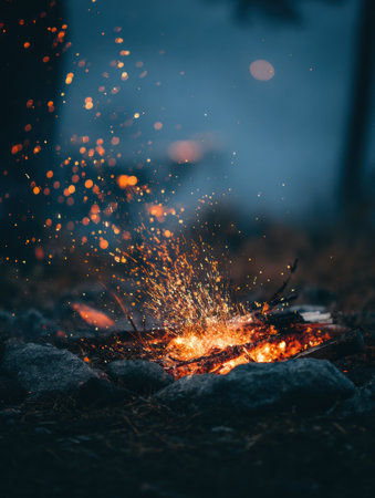 Enjoy a peaceful evening around a campfire, with sparks dancing in the night air and a warm glow illuminating the outdoor space, perfect for relaxation and gatherings.