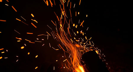 sparks and embers from campfire flying over black background