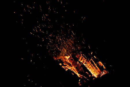 Flame of a bonfire with sparks and smoke on a black background