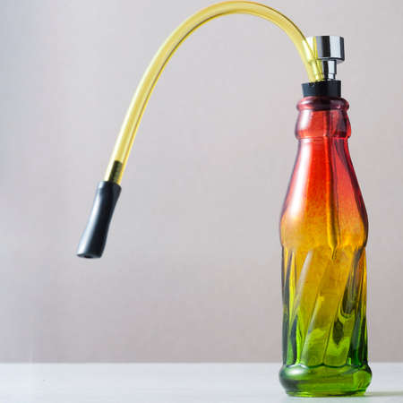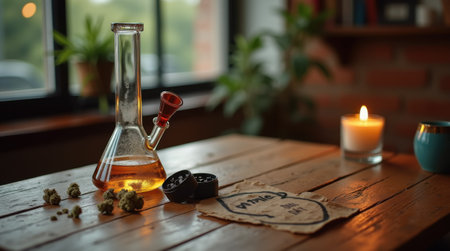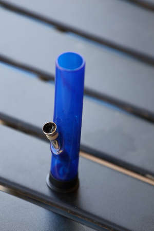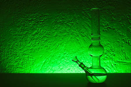 Glass bong on table, space for text. smoking device