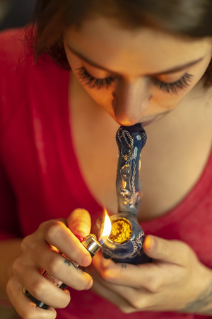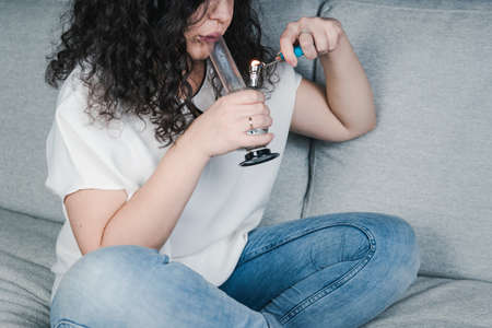 A woman lights a marijuana bong. Cannabis smoking device. A means of relaxation, concentration.
