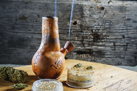 Old brown steamung bong and open cannabis grinder with chopped marijuana weed and medical cannabis in smoke by wooden desck and sackcloth. Horizontal