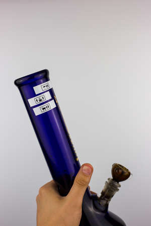 Isolated hand holding blue glass bong against white background