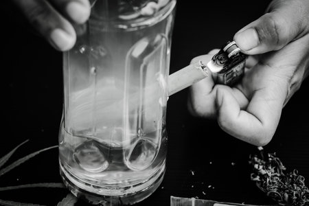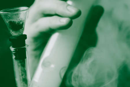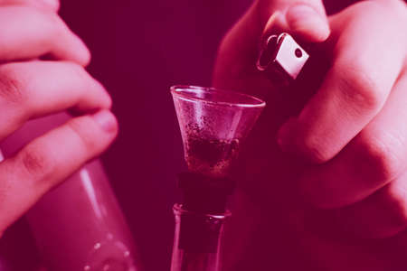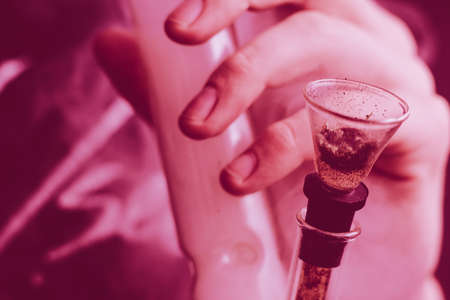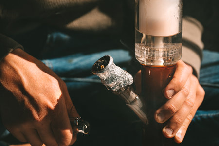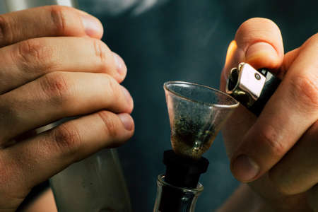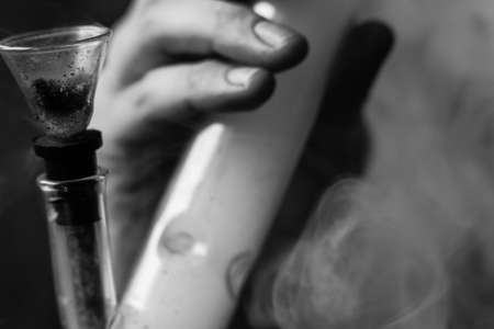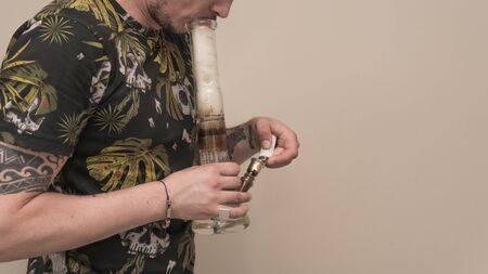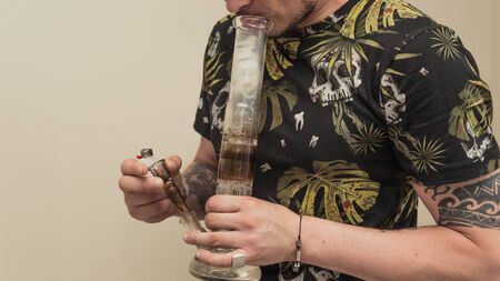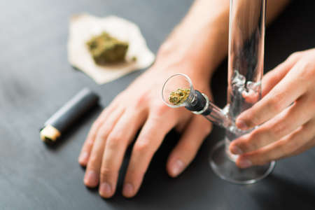 Close up of man smoking pot, medical marijuana or cannabis from a bong or water pipe. Cannabis and weed legalisation concept