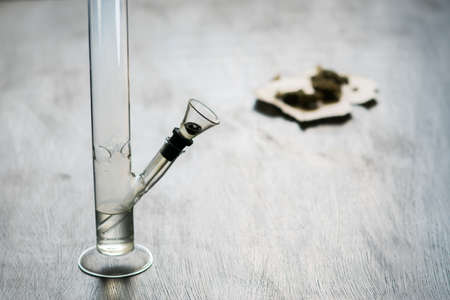 Clear glass bong. Smoking marijuana at home.