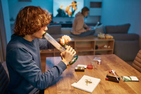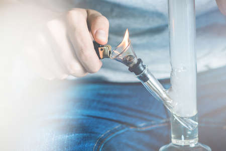 The young person smoking medical marijuana with bong, indoors. Cannabis is a concepts of alternative medicine and herbs